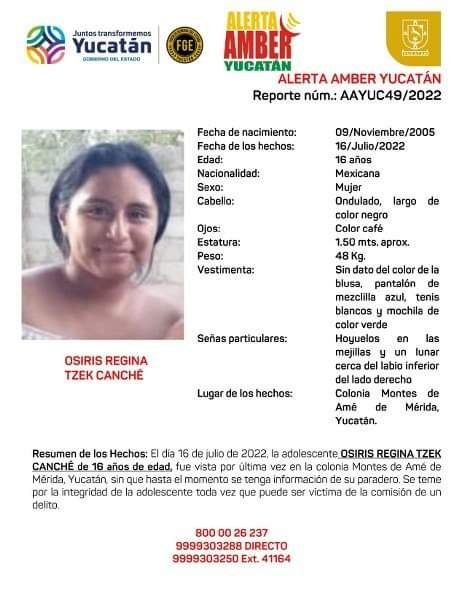 ALERTA AMBER YUCATÁN informa a Ustedes, la ACTIVACIÓN de una ALERTA AMBER Estatal solicitando su amable apoyo para la búsqueda y localización de la adolescente OSIRIS REGINA TZEK CANCHÉ de 16 años de edad, en el Estado de Yucatán.