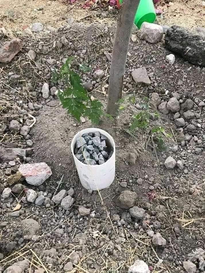 CUANDO ESTE METODO : NO SE APLICA SOLO SE SIEMBRA EL ÁRBOL Y LO RIEGAS PERO AL ECHARLE AGUA EN LA SUPERFICIE LA RAÍZ BUSCARA EL AGUA Y ESTA TIENDE A SUBIR COMO CONSECUENCIA LA RAÍZ SE LEVANTA Y PROVOCA QUE EL PAVIMENTO DE LAS CALLES Y BANQUETAS SE LEVANTE Y SE ROMPA. ES POR ESO QUE SE ESTA IMPLEMENTANDO LA INSTALACIÓN DEL TUBO DE PVC .