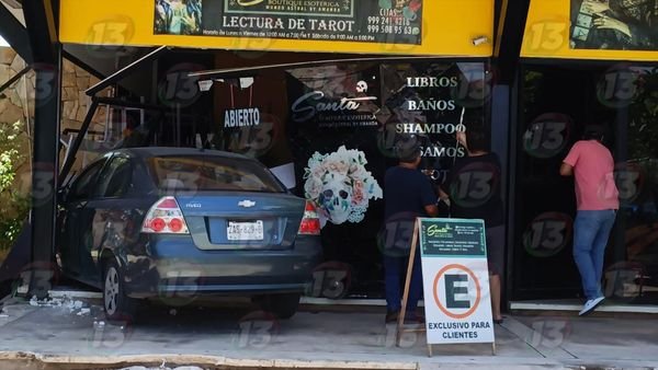 Una conductora que perdió el control de su automóvil se mete con todo y carro a una tienda de santería, justo frente al cementerio Xoclán, al poniente de Mérida.