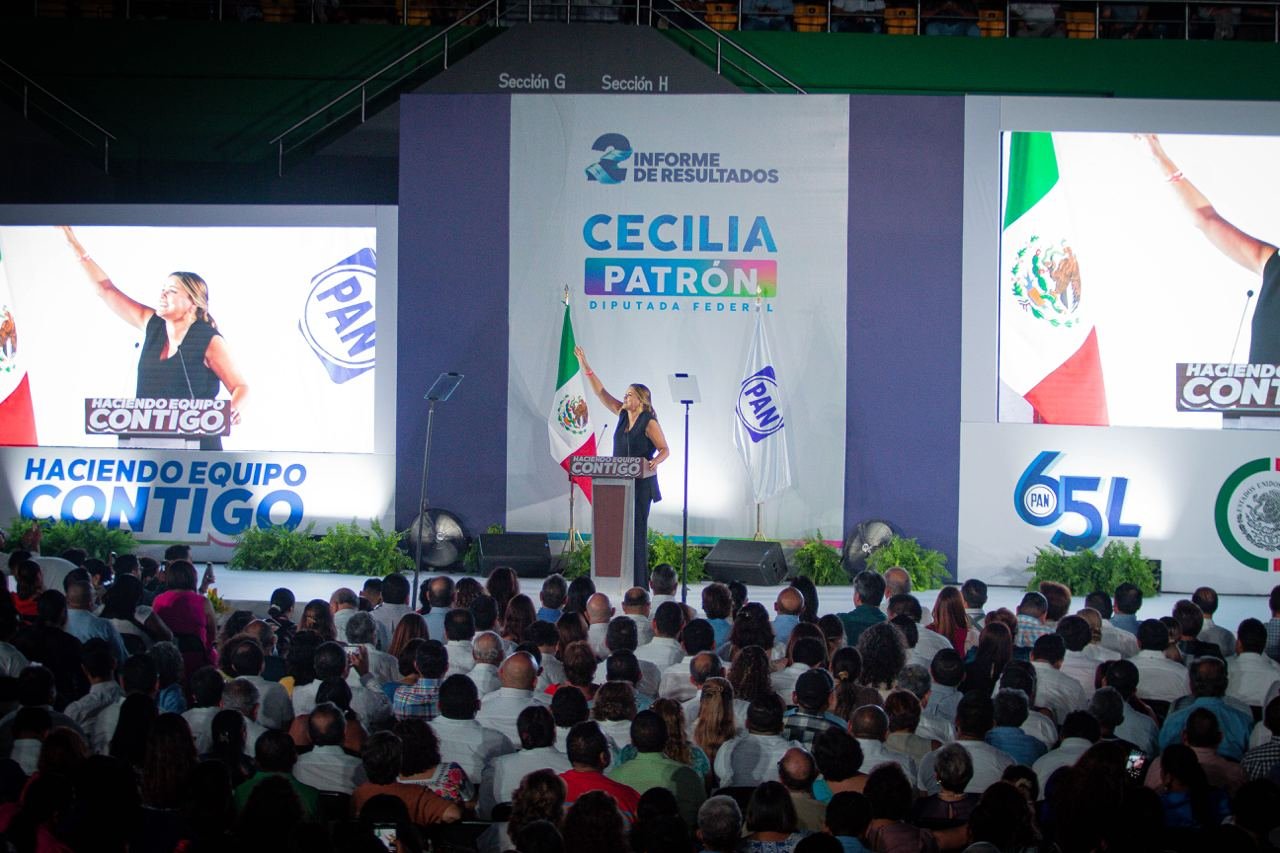 La diputada federal Cecilia Patrón Laviada presentó su segundo informe de actividades legislativas en el Poliforum Zamná donde reunió a unas 5 mil personas entre las que estuvieron los líderes nacional, estatal y municipal del Partido Acción Nacional, Marko Cortés, Asís Cano y Arturo León, respectivamente.